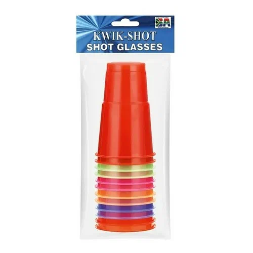 Kwik Shot 350ml Colour Cups are sold in a 12-pack, suitable for ambient storage with a shelf life of 365 days. Ideal for serving drinks at parties or gatherings.