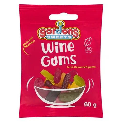 Gordons Sweets Wine Gums are a 60g pack of chewy candy in the sweets category. They have a shelf life of 365 days and should be stored in ambient conditions.