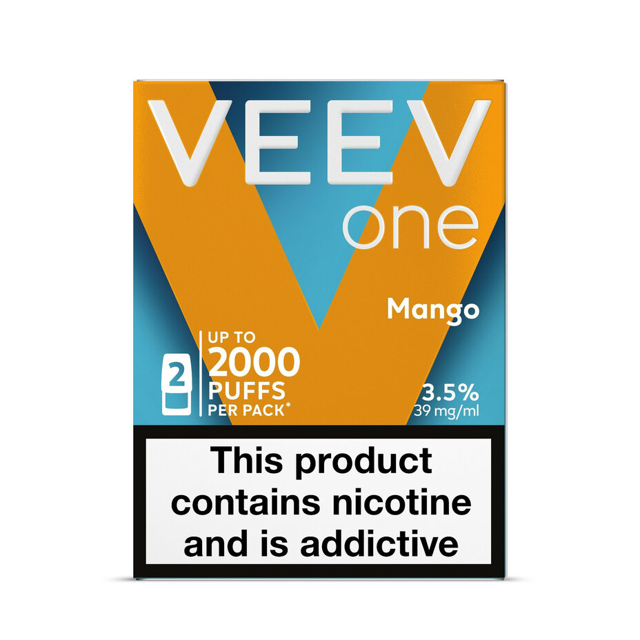 Veev One Pods in Mango flavor, 3.5% nicotine, contain 2ml each. Stored ambient with a shelf life of 365 days, suitable for use in Veev vaping devices.