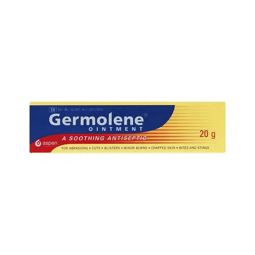 Germolene Ointment is a 20g antiseptic ointment used for minor burns, cuts, and skin irritations. Store at ambient temperature and use within 180 days of opening.