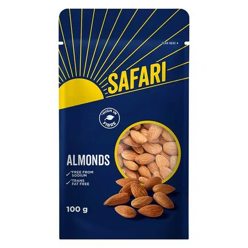 Safari Natural Almonds are a packaged snack in the Nuts & Dried Fruits category, weighing 100g. They can be stored at ambient temperatures and have a shelf life of 365 days.