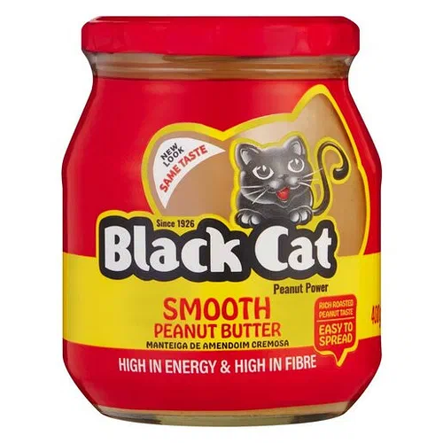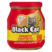 Black Cat Smooth Peanut Butter is a 400g spread made from ground peanuts. It can be stored at ambient temperature and has a shelf life of 180 days.