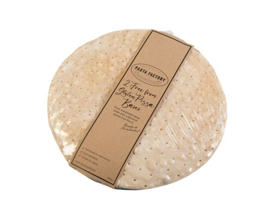 Pasta Factory Gluten Free Pizza Base 2 Pack is a frozen oven meal suitable for those requiring gluten-free options. Each pack weighs 1,000g and has a shelf life of 30 days when stored ambient.