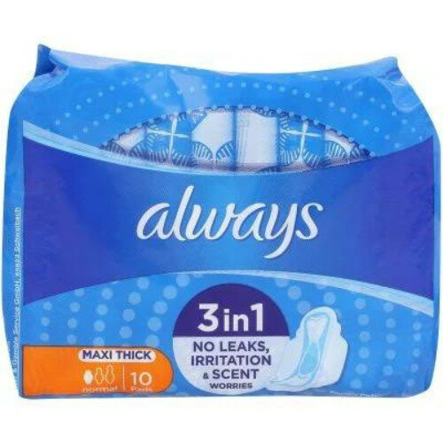 Always Maxi Thick Normal Sanitary Pads, 10 units per pack. Designed for comfort and absorbency; store at room temperature. Shelf life of 30 days.