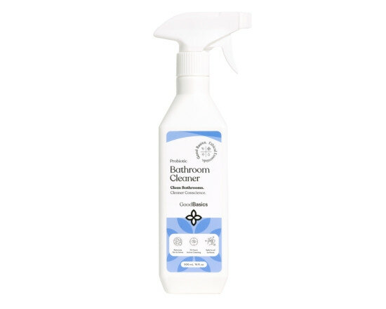 GoodBasics Probiotic Bathroom Cleaner is a 500ml liquid cleaner designed for bathroom surfaces. It has an ambient storage requirement and a shelf life of 365 days.