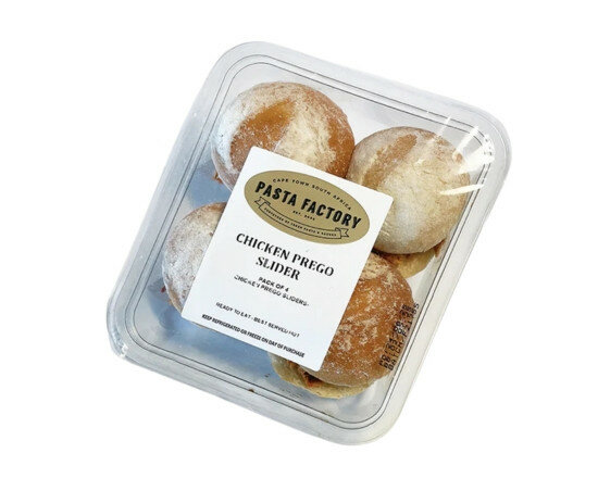 Prego Chicken Sliders are a grab-and-go lunch option, available in a 4 pack. They have a shelf life of 365 days and can be stored at ambient temperature.