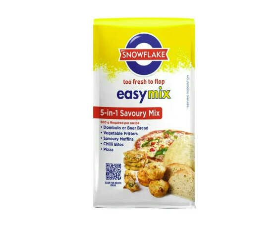 Snowflake Easy Mix 5-in-1 Savoury Mix is a 1kg baking premix suitable for various savoury dishes. Store at ambient temperature; shelf life is 90 days.
