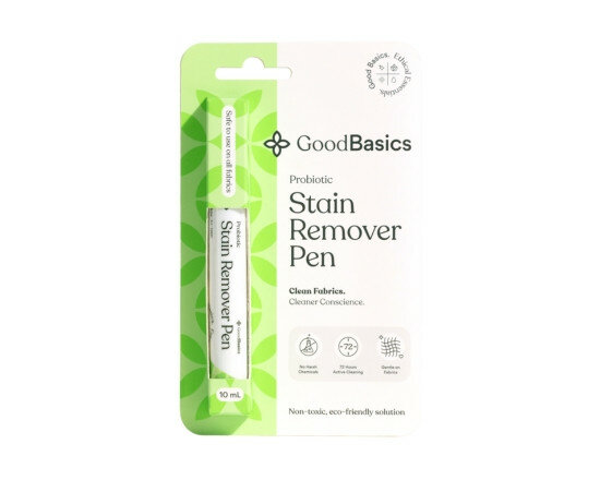 GoodBasics Probiotic Stain Remover Pen is a portable stain removal solution designed for grocery use. It has a shelf life of 365 days and is stored at ambient temperature.