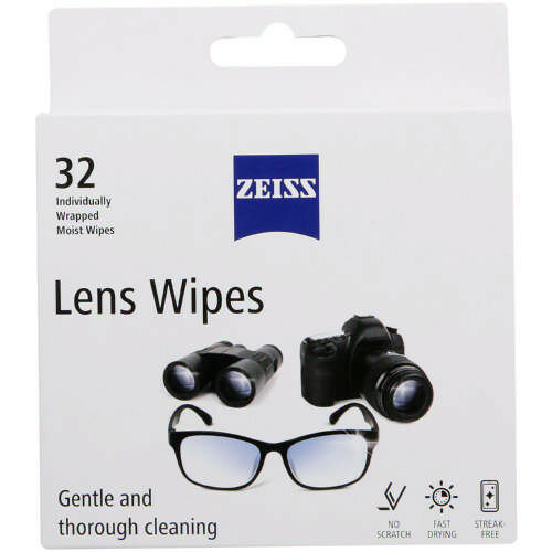 Zeiss Lens Wipes, 32-pack, are designed for cleaning lenses and screens. Store at ambient temperature; shelf life is 180 days. Total weight is 1.000g.