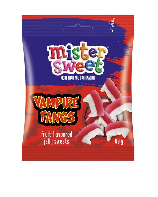 Mister Sweets Vampire Fangs are a 60g pack of novelty sweets designed for Halloween or themed events. Store at ambient temperature; shelf life is 90 days.