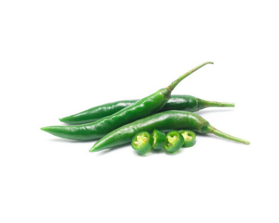 Green Chilli, 100g, is a fresh herb used for adding heat to dishes. Store in a cool, dry place; it has a shelf life of 5 days. Packaged as a unit. SKU: SKC001060.