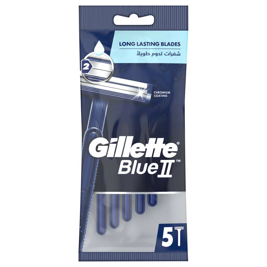 Gillette Blue II Regular Razors, 5-pack, designed for shaving and grooming. Store at ambient temperature; shelf life of 180 days. Unit based for retail sale.
