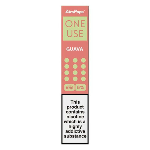 AirsPops Guava 5% is a 3ml ambient-stored aerosol product for grocery use, with a shelf life of 180 days. It is sold as a unit-based item (SKU: SKC5802).
