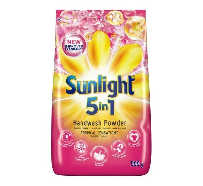Sunlight Tropical Hand Washing Powder is a laundry detergent in a 500g package, designed for hand washing clothes. It has a shelf life of 365 days and should be stored at ambient temperature.