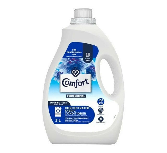 Comfort is a 3L liquid fabric softener designed for laundry use. It has a shelf life of 180 days and should be stored at ambient temperatures.