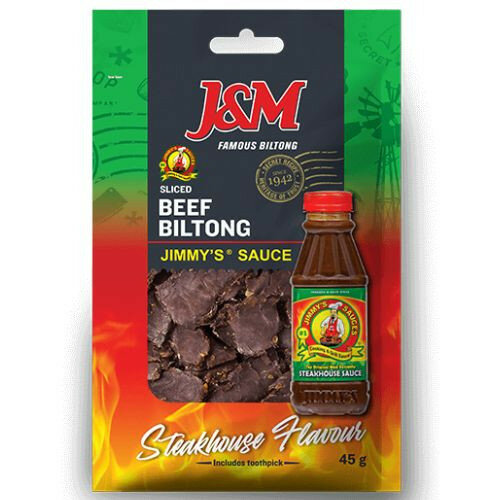 Beef Biltong Sliced with Jimmy’s Sauce, 45g, is a savory snack in the biltong category. Store in a cool, dry place; has a shelf life of 180 days.