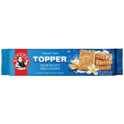 Toppers Vanilla biscuits are a 125g ambient snack within the Biscuits, Rusks & Crackers category, with a shelf life of 180 days. Ideal for casual snacking.