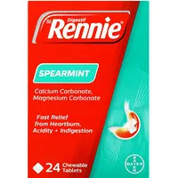 Rennie Spearmint is a digestive health product containing 24 chewable tablets. Store at ambient temperature; shelf life is 720 days. Suitable for alleviating indigestion symptoms.
