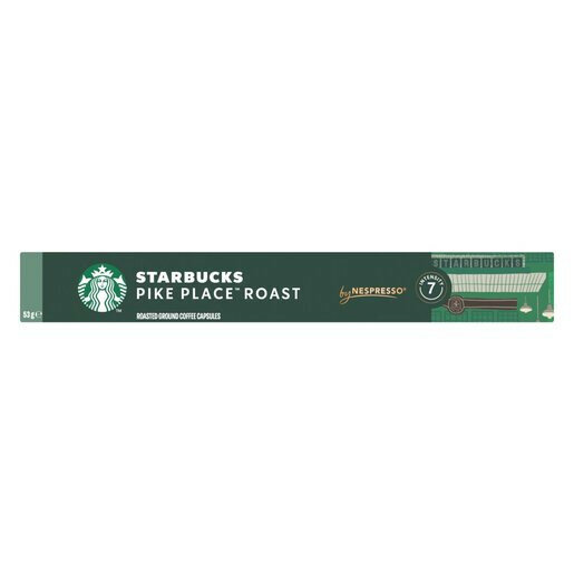 Starbucks Pike Place Capsules contain 10 coffee pods, suitable for use with compatible coffee machines. Store at ambient temperature; shelf life is 180 days. Total weight is 1.000g.