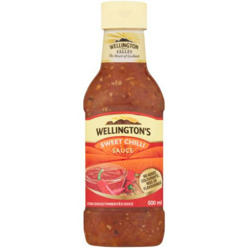 Wellington's Sweet Chilli Sauce is a 500ml condiment, suitable for enhancing dishes with a sweet and spicy flavor. It has a shelf life of 720 days and can be stored at ambient temperatures.