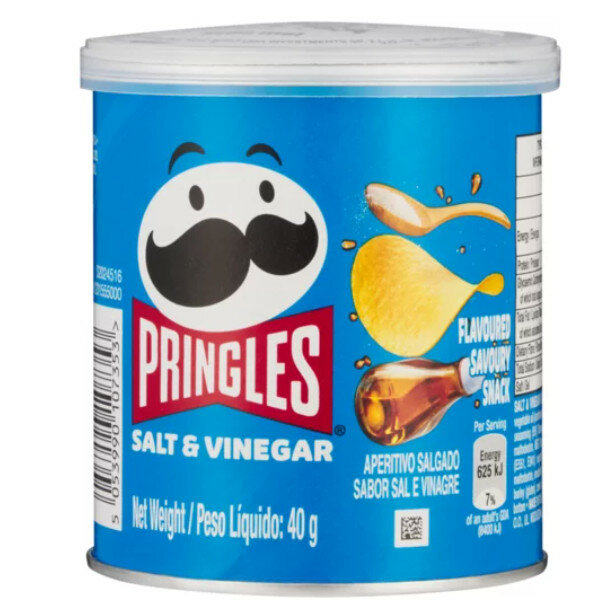 Pringles Salt Vinegar is a 40g ambient lunch box snack known for its crisp texture and tangy flavour, with a shelf life of 548 days. Sold as a single unit.