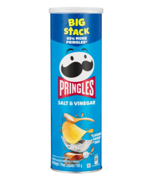Pringles Salt Vinegar is a savory potato chip snack weighing 165g. Store at ambient temperature, with a shelf life of 548 days.