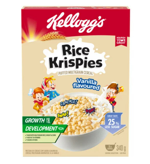 Rice Krispies Vanilla is a breakfast cereal available in a 340g box. Store in a cool, dry place and consume within 90 days of opening.