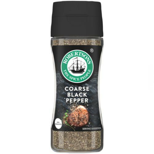 Robertsons Coarse Black Pepper is a spice available in a 52g pack. It has an ambient storage requirement and a shelf life of 1825 days.