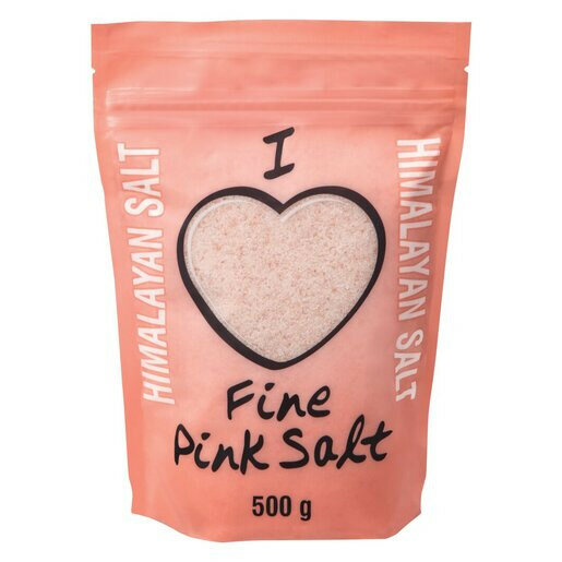 Pink Fine Himalayan Salt 500g, a mineral-rich salt from the Himalayas, ideal for seasoning. Store in a cool, dry place; shelf life of 180 days.