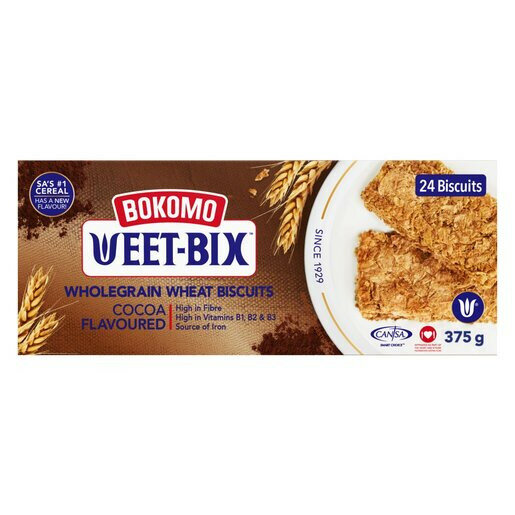 Weet-Bix Cocoa is a high-fibre breakfast cereal available in a 375g pack. Store in a cool, dry place; shelf life is 365 days.