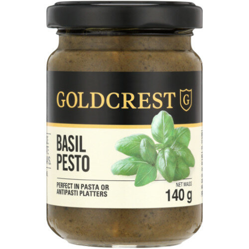 Basil Pesto 140g is a pasta sauce made from basil, pine nuts, and olive oil. It is shelf-stable at ambient temperatures with a shelf life of 180 days.