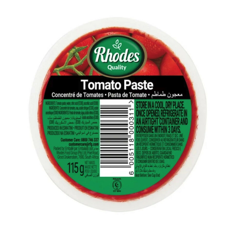 Rhodes Tomato Paste 115g is a canned tomato product, suitable for various cooking applications. It has an ambient storage requirement and a shelf life of 180 days.