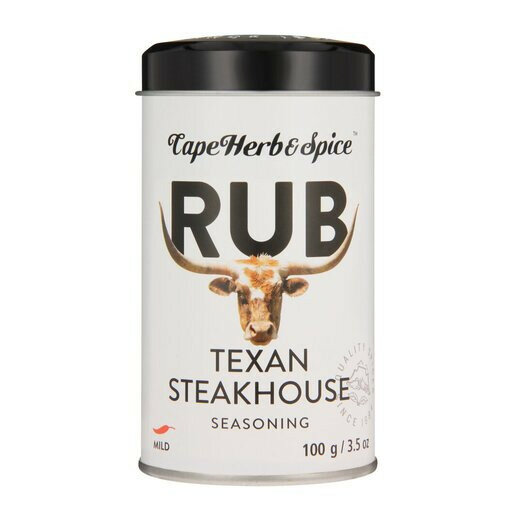 Cape Herb & Spice Texan Steakhouse Seasoning is a 100g seasoning blend designed for enhancing meat dishes. Store in a cool, dry place; has a shelf life of 180 days.