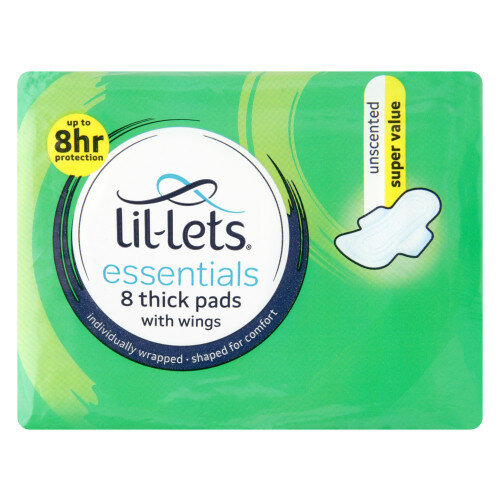 Lil-lets Essential Pads Unscented (8 count) are absorbent sanitary pads designed for menstrual protection. Store at ambient temperature, suitable for individual sale.