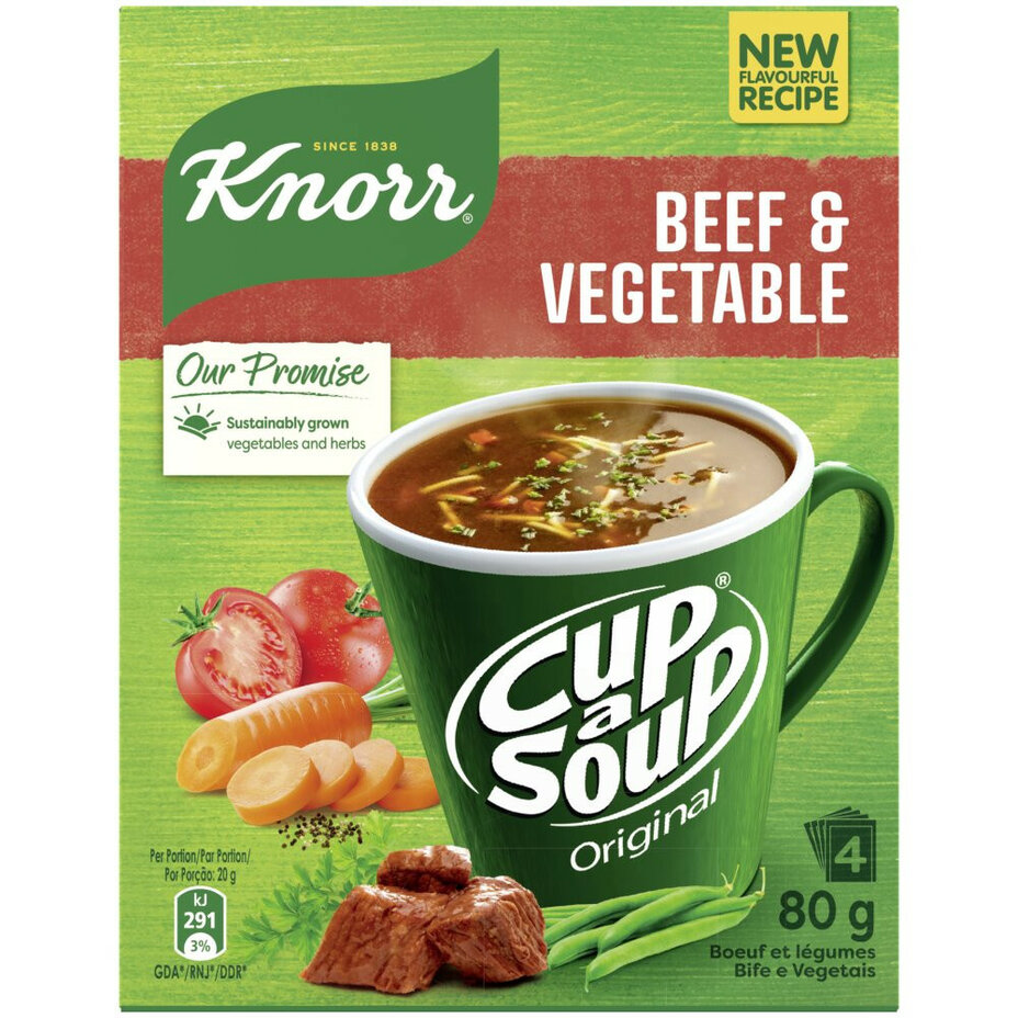 Knorr Beef Veg Cup a Soup is an 80g ambient soup mix, suitable for quick meal preparation. It has a shelf life of 365 days.