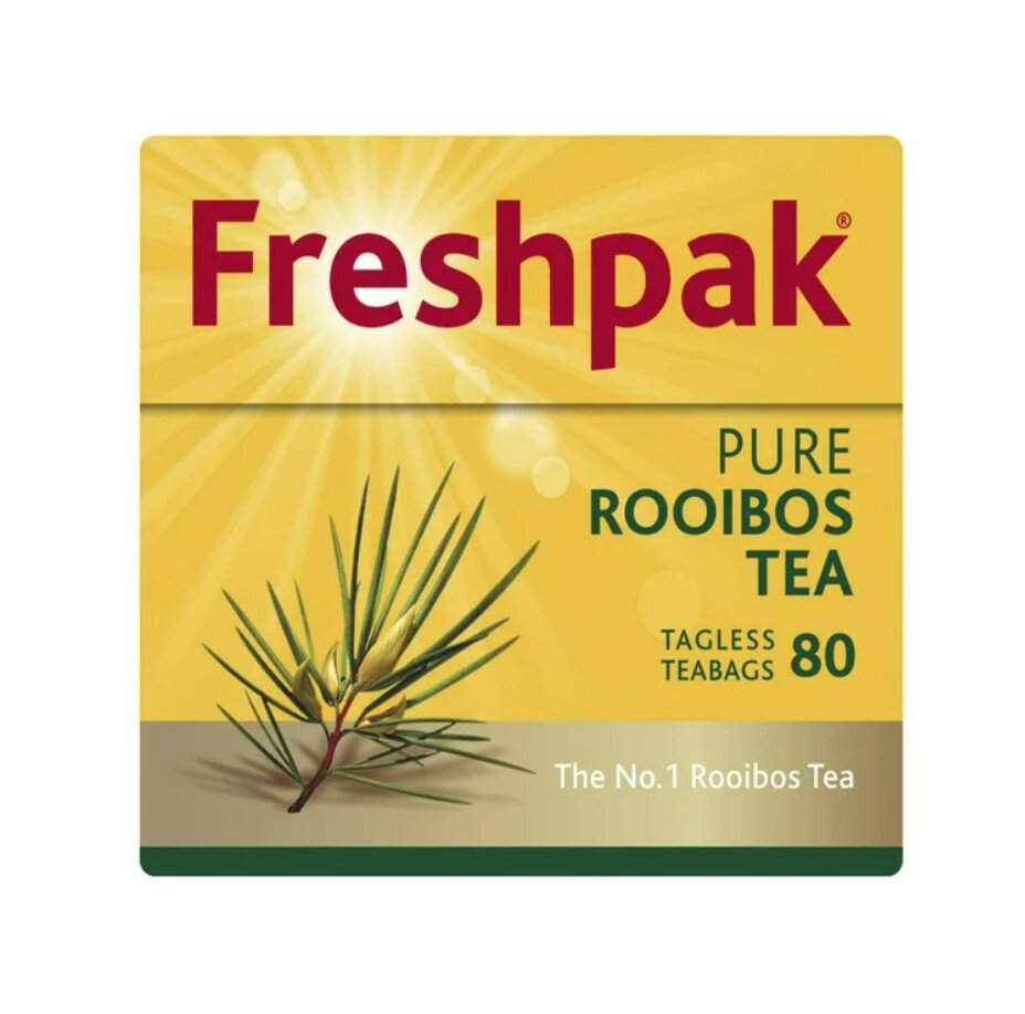 Freshpak Rooibos Tagless Teabags come in a pack of 80, weighing 1g each. Store at ambient temperature; shelf life is 180 days. Suitable for a caffeine-free beverage option.