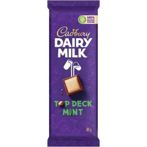 Cadbury Top Deck Mint is a 80g chocolate slab featuring a blend of milk and mint chocolate. Store at ambient temperature; shelf life is 180 days.