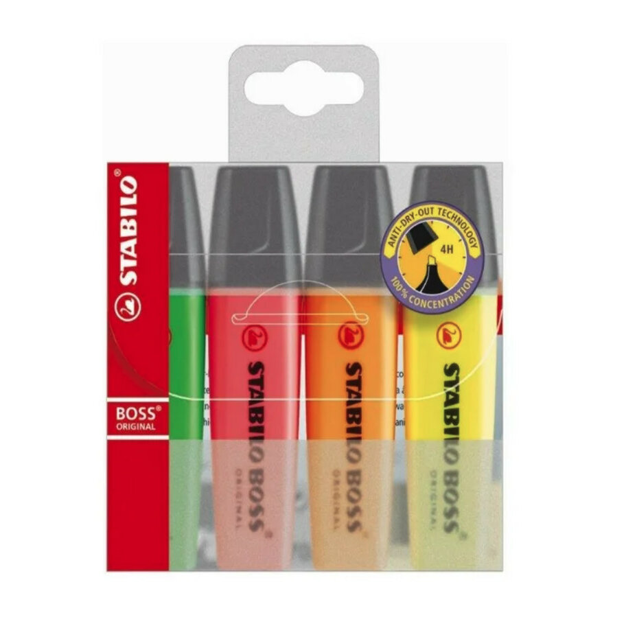Stabilo Highlighters 4 Pack in the stationery category, designed for marking or highlighting. Store at ambient temperature; shelf life is 365 days.