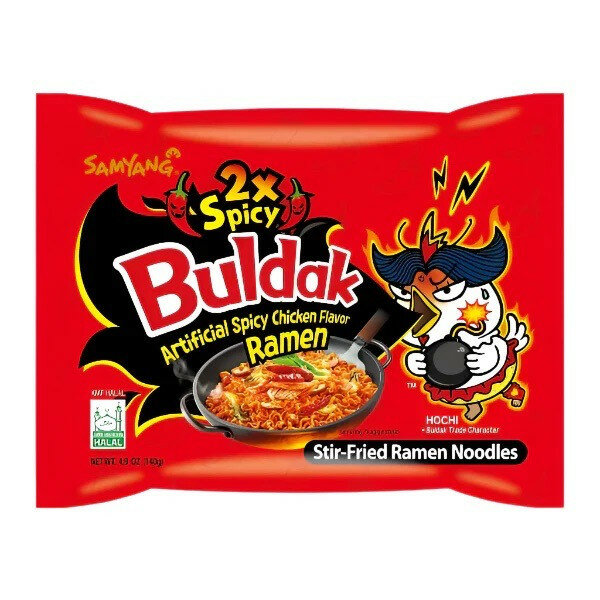 Samyang Buldak 2x Spicy noodles, 140g, are a South Korean instant noodle product known for their intense spiciness. Store at ambient temperature; shelf life is 30 days.